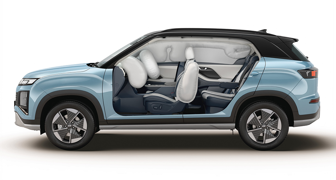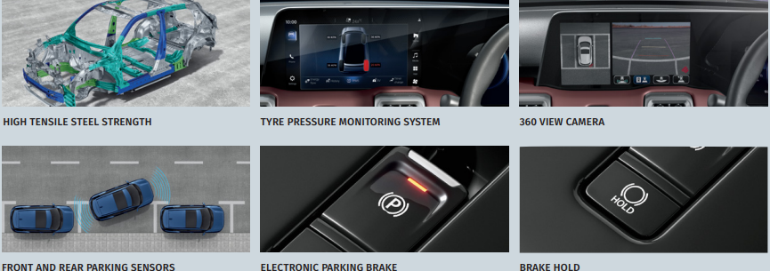 A. इसमें 6 airbags, 360-degree camera, ADAS (lane keep assist, adaptive cruise control, blind spot monitoring) और strong body structure मिलेगा।