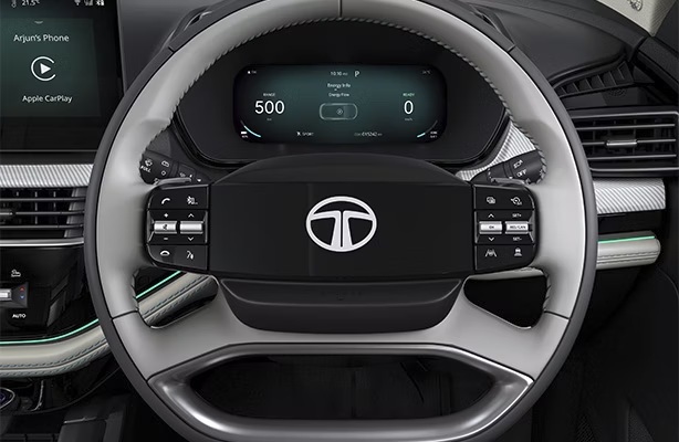 - Cabin में Harrier EV premium और futuristic feel देता है। Interior में 3 trim options हैं और steering wheel four-spoke design के साथ आता है जिसमें illuminated Tata logo है।